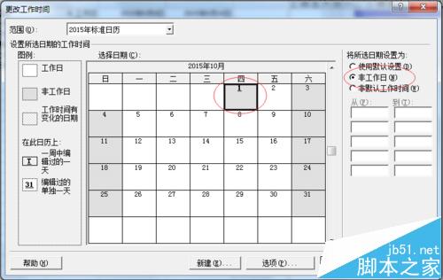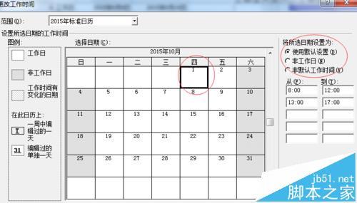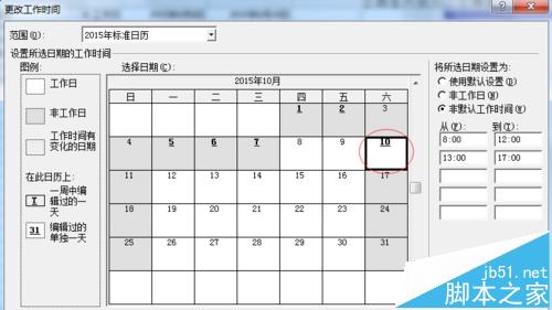 8、原先10月10号是周六非工作日的,按照节假日安排,我们现在要把他设置成工作日。具体操作如下,点击10月10号,然后在右边“将所选日期设置为”中将他设置为“非默认工作时间”。按照图2的操作,你就会日历出现了从图1到图3的变化,10月10号变成工作日了