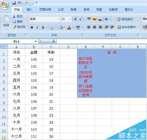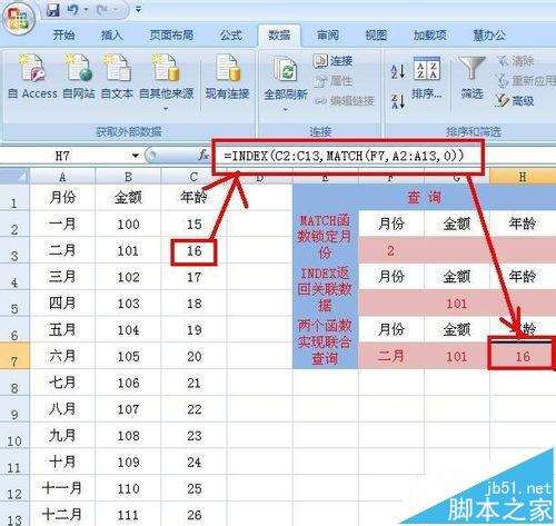 2、用同样的方法再H7单元格中输入:=INDEX(C2:C13,MATCH(F7,A2:A13,0)),即可查询出月份对应的年龄。