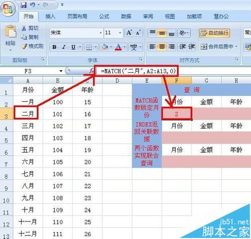 2、选择F3单元格,在单元格中输入:=MATCH("二月",A2:A13,0),回车可以看到二月所对应的行数为2.