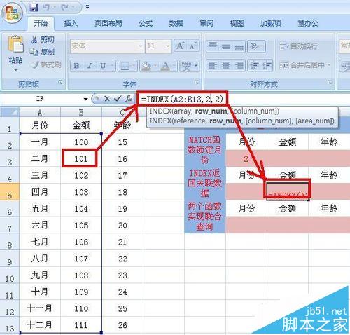 1、选择G5单元格,在单元格中输入:=INDEX(A2:B13,2,2),回车可以看到A2:B13区域中2行2列交叉对应的值.