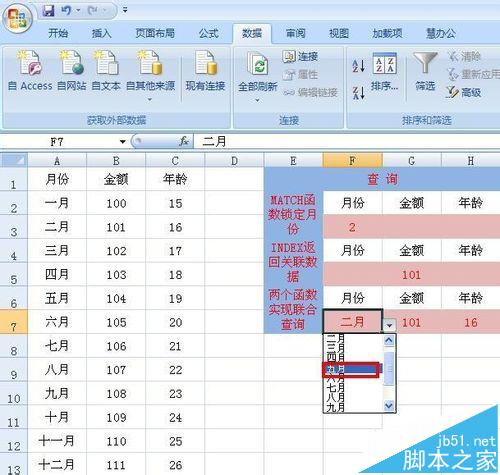 1、选择G7单元格,在单元格中输入:=INDEX(B2:B13,MATCH(F7,A2:A13,0)),用MATCH函数返回F7单元格中的之所对应的行,再利用ATCH函数返回的行号用INDEX函数查询出月份对应的金额。