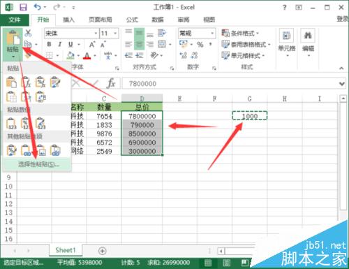 2、在打开的Excel工作表中,首先复制G2单元格的数据,再按住键盘的Ctrl+C键进行复制,选中D2:D6单元格区域,点击“粘贴”-->“选择性粘贴”选项。如图所示;