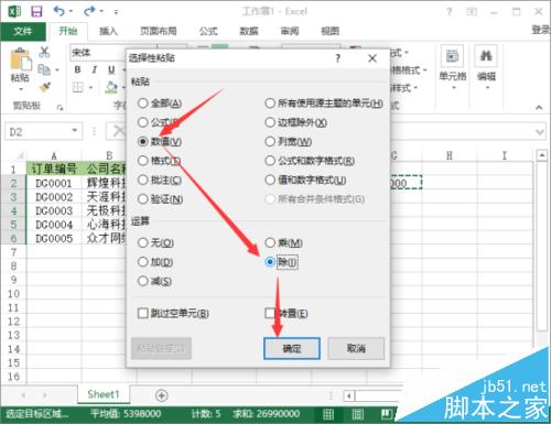 3、在弹出的选择性粘贴对话框中,选择“粘贴”为“数值(V)”,运算法则选择“除”,然后再点击“确定”按钮。如图所示;