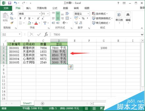 6、最后返回到工作表编辑窗口,可以看到D2:D6单元格区域里的数据变为了以千元为单位的。如图所示;