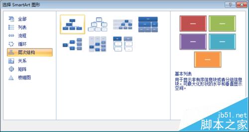4、弹出“选择SmartArt图形”对话框,在左侧列表框中选择“层次结构”选项,在中间的SmartArt图形列表框中选择“组织结构图”选项。