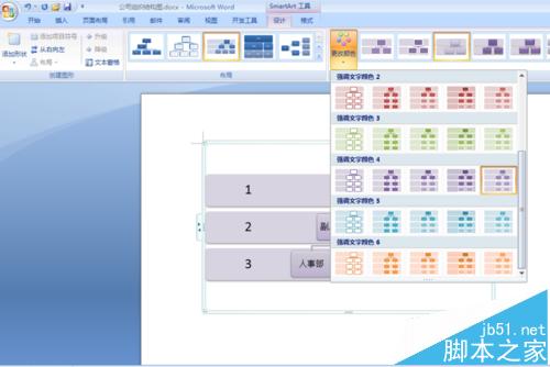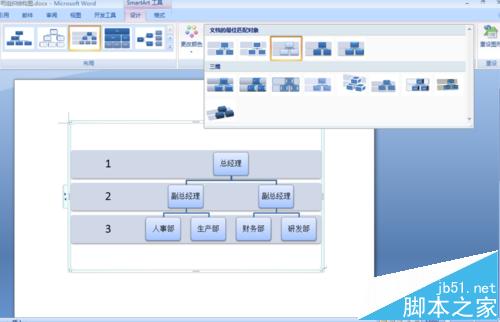 6、选中插入的组织结构图,单击“设计”选项卡下“布局”组中的布局列表右侧的下拉按钮,在弹出的下拉面板中选择第1排第3个图形。