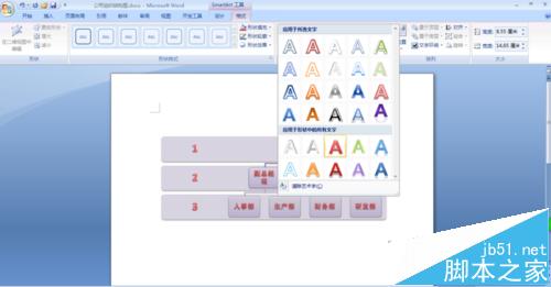 13、单击“格式”选项卡下“艺术字样式”组中的样式列表下拉按钮,在弹出的下拉面板中选择“应用于形状中的所有文字”组中的第1排第3个选项。