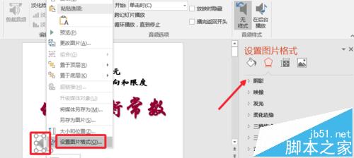 4、为了让插入的音频图标好看些,我们可以在上面点击右键,设置图片格式,根据自己需要进行一些设置,对喇叭图标设置比较简单,这里就不介绍了。