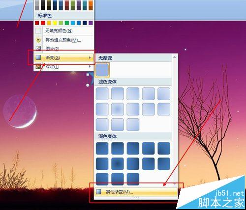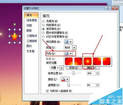 3、修改星星填空颜色。双击星星,选择工具栏中的形状填充,选择渐变,选择其它渐变,选择红色。为了效果更逼真,可以设置其它的选项,比如旋转等等。
