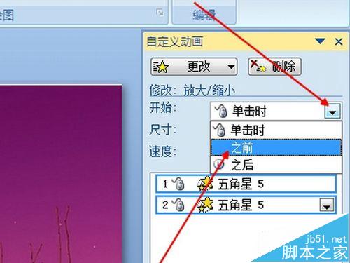 3、修改星星动画。选择动画工具栏中第一个动画,右面的箭头,选择效果选项,选择尺寸,修改变化的幅度,可以设置不同的比例,以达到星星闪烁的效果。