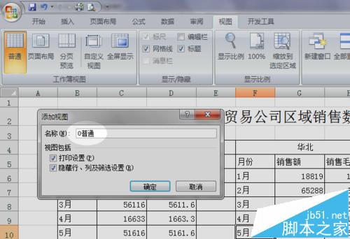 4、弹出“添加视图”对话框,在“名称”文本框中输入“0普通”,该视图保存整个工作表默认打开的状态。