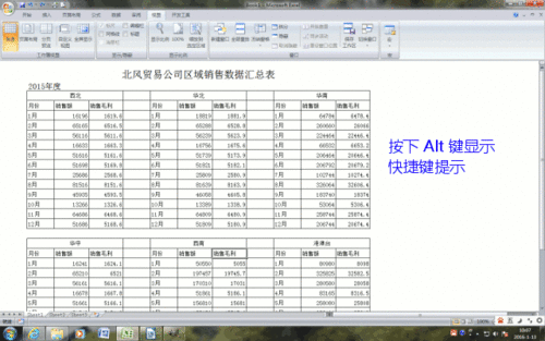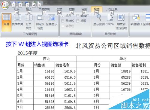 在公司例会等展示工作场景中,打开工作簿,依次展示不同区域的数据视图。在展示的过程中,使用键盘快捷键的方法操作自定义视图,会更加高效,也显得更加专业:在默认普通视图状态,按下 Alt 键,Excel 显示功能区选项卡快捷字母;按下 W 键,进入“视图”选项卡。