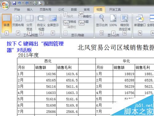 11、这时,Excel 将显示“视图”选项卡内部各按钮的快捷键字母;按下 C 键,调出“视图管理器”对话框。