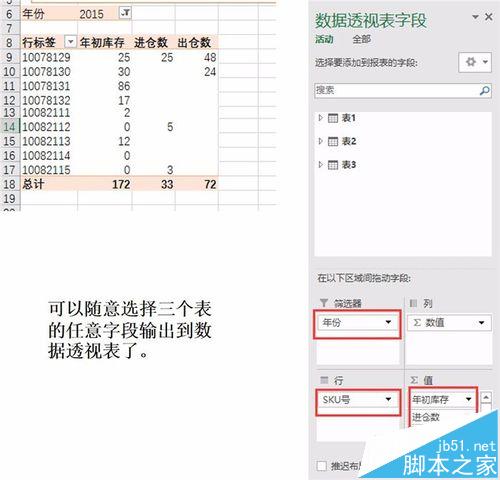 之前虽然改了名字,但数据透视表中显示的还是表1表2表3,这里只好把这个Bug放一放,期待office升级解决吧。拖拉表2的年份到“筛选器”,拖拉SKU码到“行”,拖拉表2的年初库存、表3的进仓数和出仓数到“值”。这样,数据透视表就按每一个SKU输出了其合计进仓数和出仓数,也将期初库存显示出来了。注意:系统会对值增加汇总方式的描述,例如:以下字段求和汇总:进仓数,我嫌太长,手工改成进仓数了。
