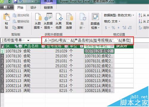 10、如何显示产品名称。光看SKU码不直观,要将名称、规格加进去怎么做?进入PowerPivot 界面。选进编码表,在数据表区域,新增一列名叫“名称型号单位”,在该列1行的单元格输入=[SKU号]&"," &[产品名称]&[型号规格]&","&[单位]选择。系统会自动填充整列。回到Excel界面,数据透视表的行标题统统用“名称型号单位”就可以解决这个问题了。