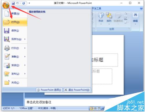 2、在打开的PowerPoint2007编辑窗口,点击左上角的“Office”图标。然后在点击“打开”选项命令。如图所示;