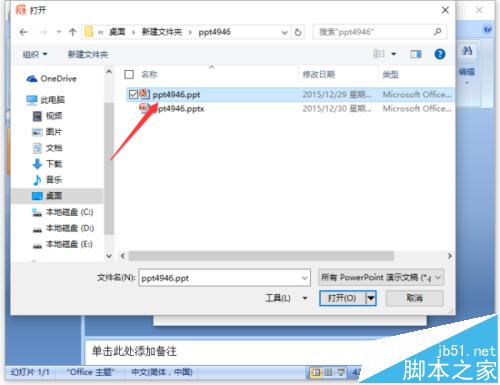 3、接着在打开的对话框中,找到存放PPT幻灯片的目录,将需要打开的PPT幻灯片文件选中。如图所示;