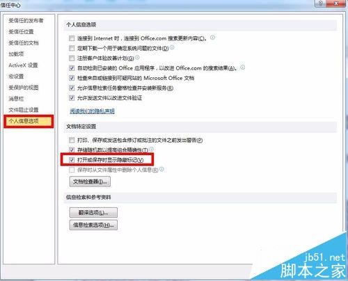 4、在“信任中心设置”里面选择“个人信息选项”, 取消“打开或保存时显示隐藏标记”的选定,点击“确定”后保存文档。