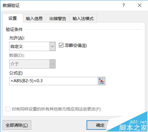 5、在设置中【条件】选择:自定义【公式】输入:=ABS(B2-5)<0.3,然后点击确定