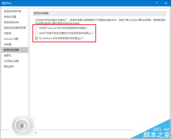 5、在左侧列表中选择“受保护的视图”,然后取消勾选右侧三个选项后,点击“确定”,如下图——