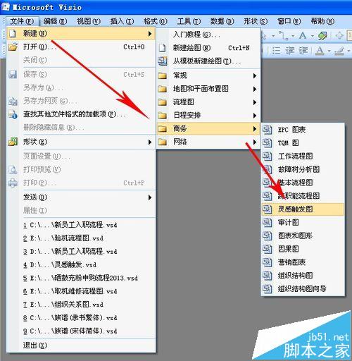 1、新建灵感触发图的方法很简单,打开VISIO软件,依次点击“文件”-“新建”-“商务”-“灵感触发图”即可,如下图示: