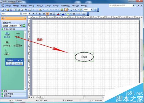 2、我们可以看到灵感触发图用到的图型形状组件很简单,主要是符合灵感触发的特点,简点记下要点再发散思维思考并完整枝叶。首先要做的是主标题(也就是主题),在形状区拖动主标题形状到编辑区即可,拖动后双击即可修改内容,如下图示: