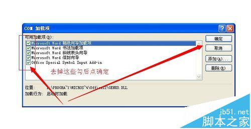 4、去掉加载项中的那些前面的:勾。然后点击:确定