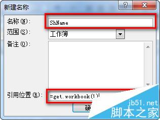 2、在【名称】框里输入一个定义名称(本例输入ShName),方便在工作表中引用。在【引用位置】处输入=GET.WORKBOOK(1),设置完毕后点击【确定】按钮。