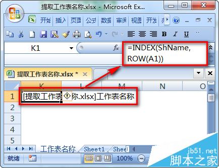 3、双击一个单元格,输入公式:=INDEX(ShName,ROW(A1)),这时就返回了包括工作簿名称的工作表名称。