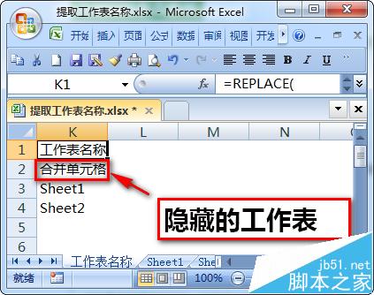 注意:工作簿中隐藏的工作表名称也会显示出来,本例隐藏了一个名称为“合并单元格”的工作表。
