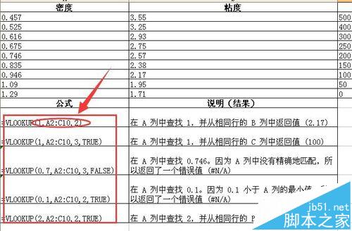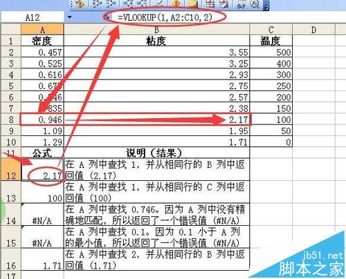 3、在a14单元格中输入公式=VLOOKUP(0.7,A2:C10,3,FALSE) 函数的作用是在 A 列中查找 0.7。因为 A 列中没有精确地匹配,所以返回了一个错误值 (#N/A)