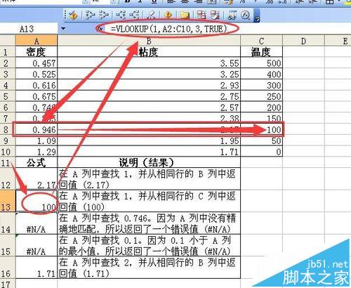 2、在a13单元格中输入公式=VLOOKUP(1,A2:C10,3,TRUE) 函数的作用是在 A 列中查找 1,并从相同行的 C 列中返回值 (100)