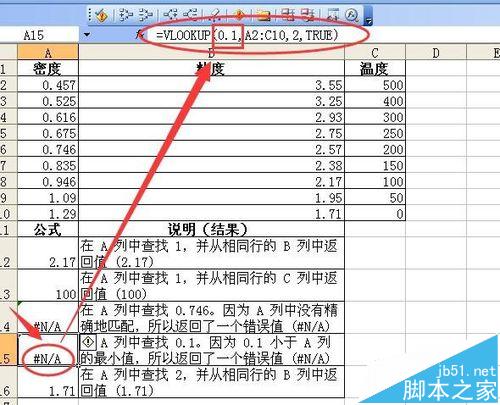 4、在a15单元格中输入公式=VLOOKUP(0.1,A2:C10,2,TRUE) 函数的作用是在 A 列中查找 0.1。因为 0.1 小于 A 列的最小值,所以返回了一个错误值 (#N/A)