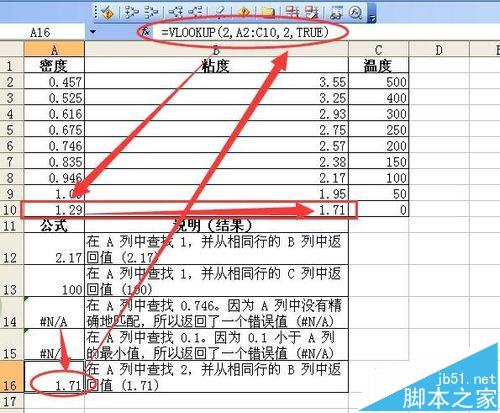 5、在a16单元格中输入公式=VLOOKUP(2,A2:C10,2,TRUE) 函数的作用是在 A 列中查找 2,并从相同行的 B 列中返回值 (1.71)