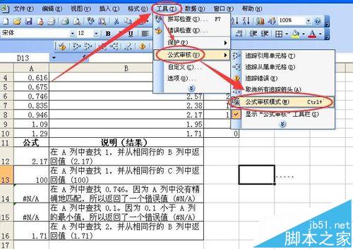 6、点快捷键 Ctrl+`(重音符),或在“工具”菜单上,指向“公式审核”,再单击“公式审核模式”