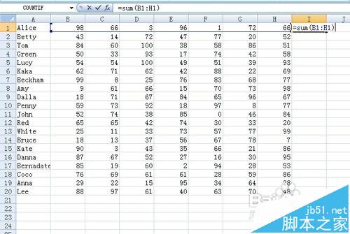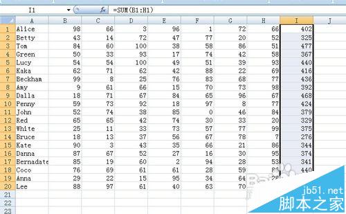 2、在I1单元格中输入函数=sum(B1:H1) 按下enter键 即在I1单元格中计算出第一位同学的总分 如下图所示 将光标移动到I1单元格右下角 鼠标呈十字架状 下来列表 如下图 即完成所有同学总分的计算。