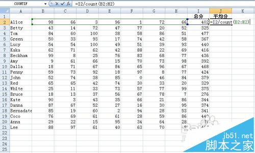 1、将光标移动到J2单元格,如下图示。输入函数=I2/count(B2:H2) 按Enter键 然后将鼠标下拉 方法同步骤2 得到的结果下图所示