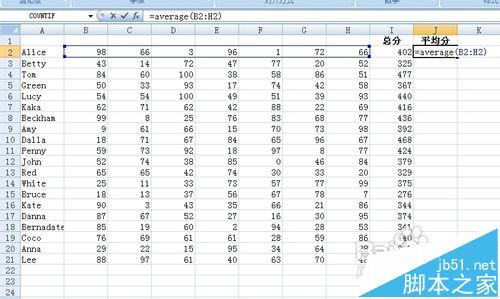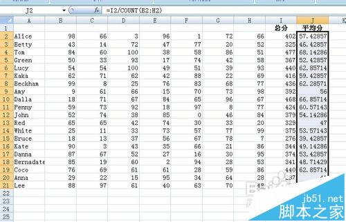 2、将光标移动到J2单元格。输入函数=average(B2:H2) 按下Enter键 然后将鼠标下拉 方法步骤同上 得到的结果如下图所示 这里显示的结果和方法1是一样的~