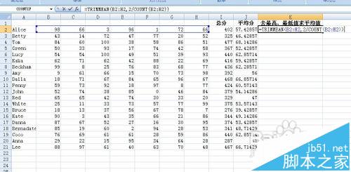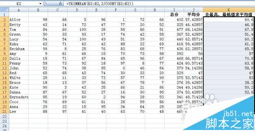 1、将光标移动到K2单元格中,输入函数=TRIMMEAN(B2:H2,2/COUNT(B2:H2))。按下Enter键 然后将鼠标下拉 方法步骤同上 得到的结果如下图示: