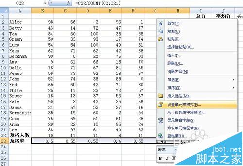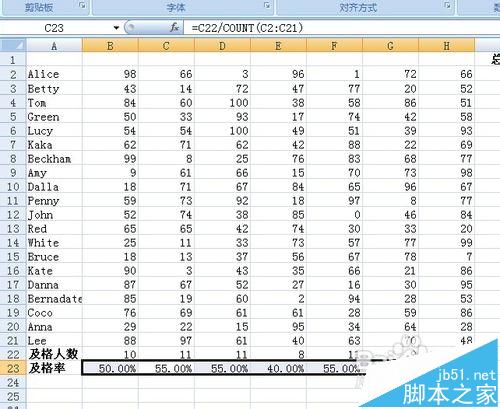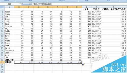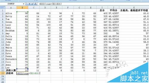 将光标移动到B23单元格,输入函数=B22/COUNT(B2:B21)。(这个函数的原理:及格率=及格人数/参考总人数)