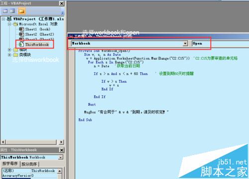 2、双击左侧工程里面的ThisWorkbook,然后选择代码窗口里的workbook和open