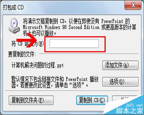 1、打开你的ppt文件,执行文件-打包成cd,在打包成cd对话框中,对将cd命名为修改成你自己想要设置的名字。