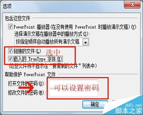 2、在打包成cd对话框内,点击选项,在选项对话框内选中链接的文件和嵌入的truetype字体,也可以根据自己的需要设置打开和修改的密码,设置完毕点击确定。