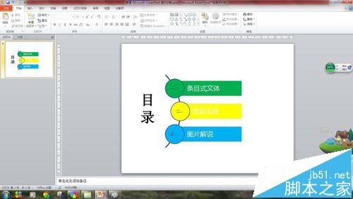 4、下面所示的图形就是用Smartart中列表图形制作的目录页,当然颜色、字体,包括文字内容可按自己的要求进行添加和设置。