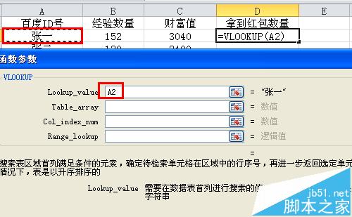 5、弹出来的函数参数中,在第一个填写框vlookup_value中直接点击A2的”张一”。(如下图)
