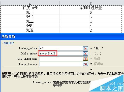 6、在第二个填写框Table_array中全选表格2,表格2中A列和B列都包含了。(如下图)