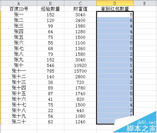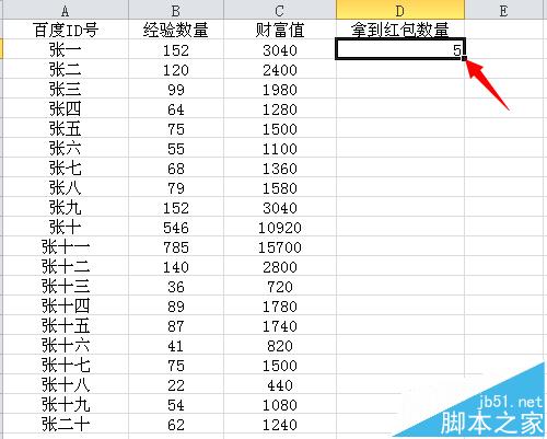 8、这时D列的D2显示5,表示张一拿到5红包,因为刚才的函数公式是跟张一对应的,所以出现了张一的数据,如果想要其他人的数据时,可以把鼠标放到D2选项框的右下角,等到出现一个“+”号时,双击鼠标左键。(如下图