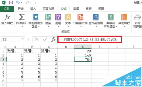 =sumproduct({1;2;3;4;5;6;7},{1;2;3;4;5;6;7})=1*1+2*2+3*3+4*4+5*5+6*6+7*7=140。
