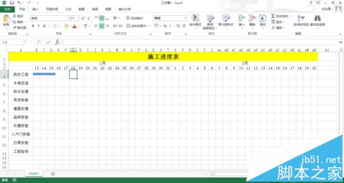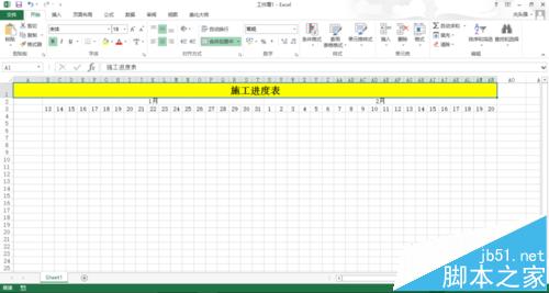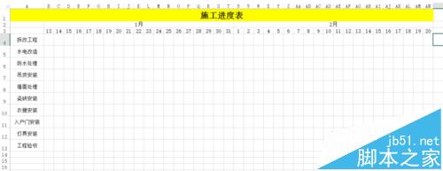2、接下来调整excel表格的列宽,设置施工进度图的月份及日期,还有施工进度图的名称,如下图所示。