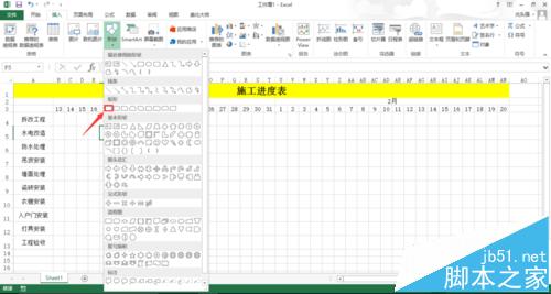 4、以上内容设置完毕之后,可以点击上方菜单栏里的【插入】选项,找到【形状】功能选项点击弹出下拉菜单,可以选择直线或矩阵来标注每个项目的施工时间,如下图所示。